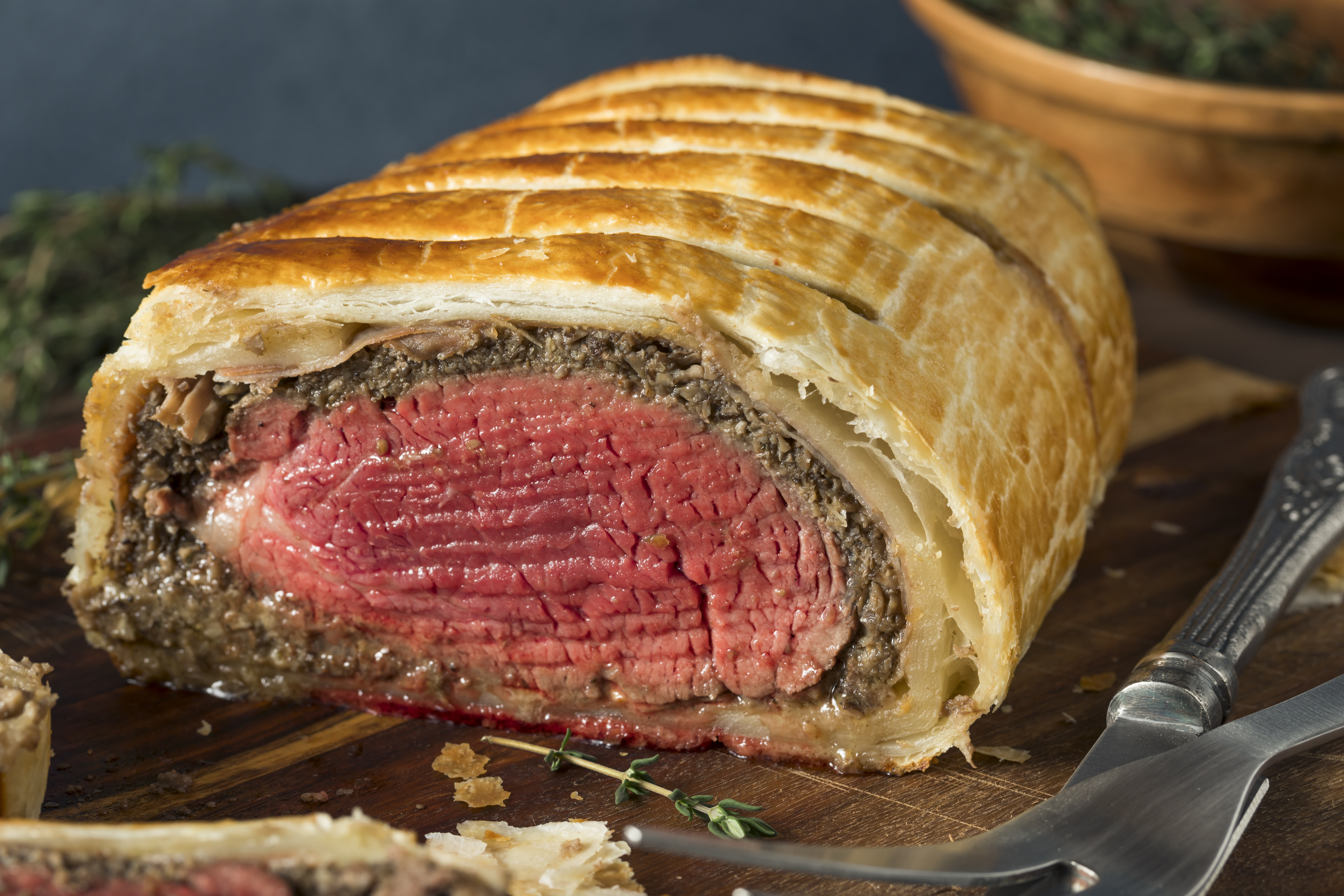 Filetto Alla Wellington: Prevede la doppia cottura della carne, che viene prima scottata in padella, poi ricoperta salsa ai funghi e prosciutto crudo, per poi essere avvolta nella pasta sfoglia e terminare la cottura in forno.